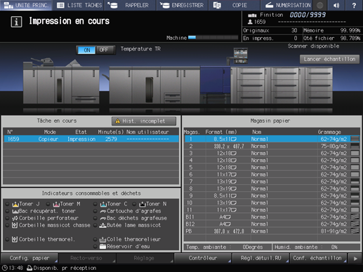 Le bouton Lancer échantillon est affiché sur l'écran UNITÉ PRINC. pendant l'impression. Appuyez sur la touche au moment voulu pour imprimer la même image que celle en cours d'impression, dans le magasin auxiliaire, pour vérifier la qualité de l'image imprimée à ce moment précis.