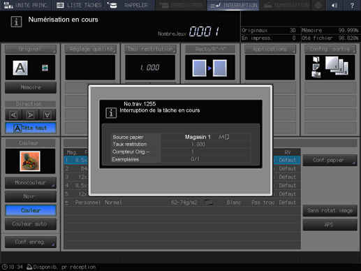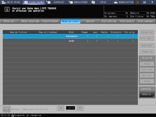 Explication supplémentairePendant la copie d'interruption, la tâche d’interruption s'affiche en haut de la liste En impression de l'écran LISTE TÂCHES.