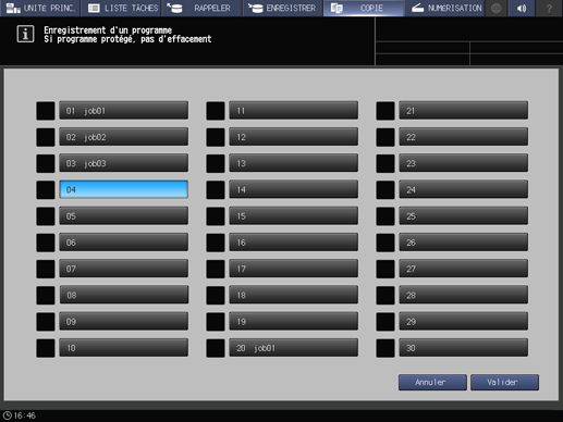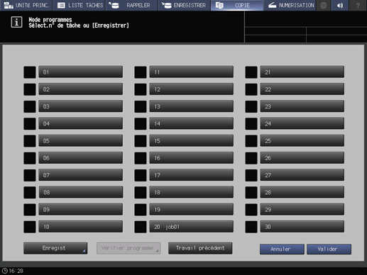 • condition préalableUne tâche enregistrée se voit attribuer un numéro de tâche (de 01 à 30) et un nom alphabétique (facultatif).