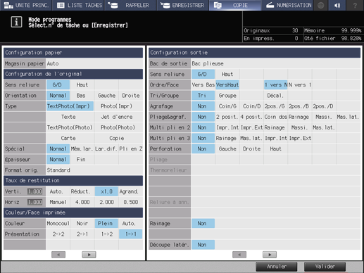 • condition préalableRéglages disponibles : Réglage papier, Caractéristiques de l'original, Taux de restitution, Couleur/Face imprimée, Réglage qualité, Réglage sortie, Applications