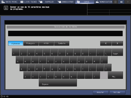 • Explication supplémentaireVous devez entrer un nom pour la tâche. Vous ne pouvez pas revenir à l'écran Mode Programmes même en appuyant sur Valider sans entrer de nom pour la tâche.