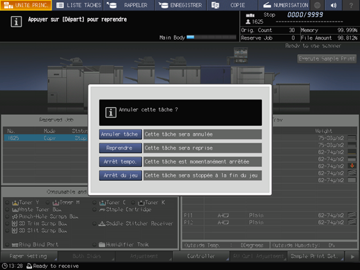 Pour poursuivre les tâches, actionnez l'interrupteur secondaire afin d'afficher l'écran UNITÉ PRINC. et appuyez sur la bouton Départ du panneau de contrôle.