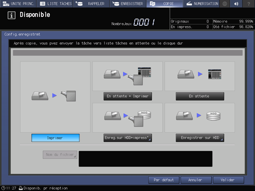 Lorsque vous sélectionnez En attente + Imprimer ou Enreg.sur HDD+impress°, la tâche est copiée et mise en attente ou enregistrée sur le disque dur.