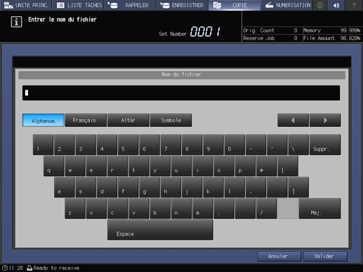 Appuyez sur Nom de fichier sur l'écran Conf.enregistrmt. pour afficher la boîte de dialogue Nom de fichier, entrez le nom de fichier et appuyez sur Valider.