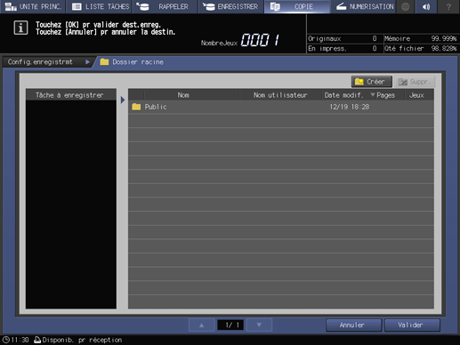 Sélectionnez Enreg.sur HDD+impress° ou Enregistrer sur HDD pour afficher l'écran Dossier racine, spécifiez ensuite la destination d'enregistrement d'une tâche enregistrée sur le disque dur.