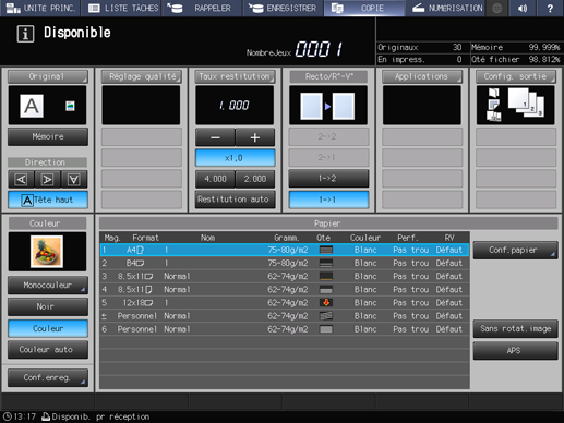 Un travail enregistré sur le disque dur peut être imprimé sur l'écran RAPPELER ou mis en attente sur la machine.