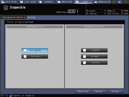 Ce mode réalise l'agrafage des copies. Sélectionnez un des cinq types de position d'agrafage suivants.