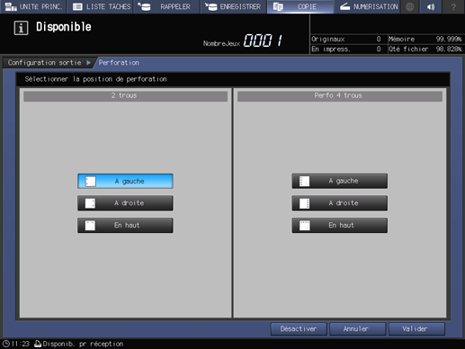 Appuyez sur la touche souhaitée pour sélectionner le type et la position des trous perforés.