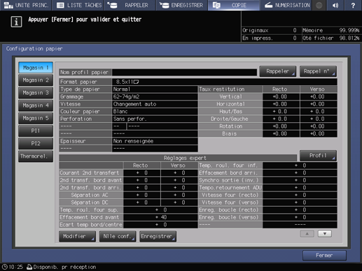 Explication supplémentairePour modifier temporairement la configuration papier, effectuez les changements sur l'écran Configuration papier. Pour en savoir plus, voir Configurer le papier d'un magasin.