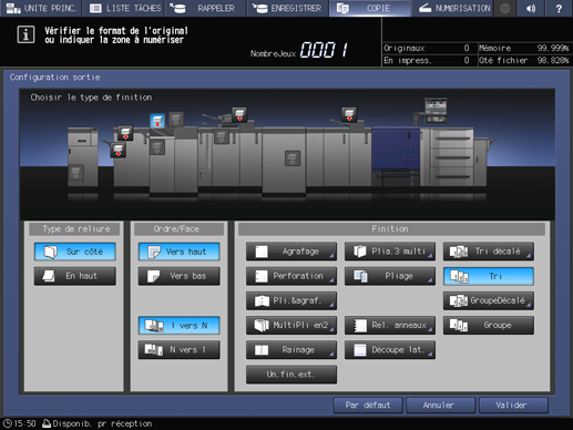 Explication supplémentaireIl est recommandé d'appuyer sur le bouton Copie test du panneau de contrôle pour imprimer une copie test avant de réaliser la reliure de jeux multiples.