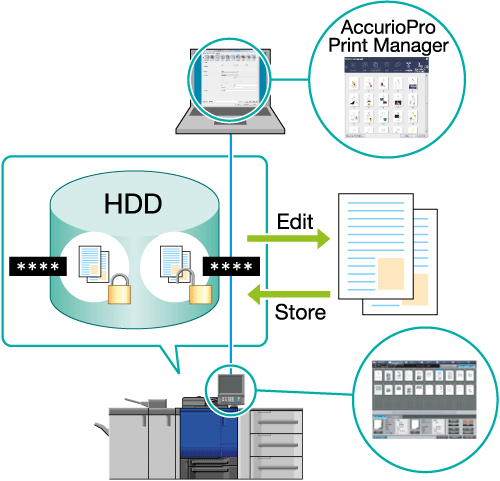 Les tâches peuvent être exploitées sur l'écran tactile de la machine ou à l'aide de AccurioPro Print Manager installé sur un ordinateur.