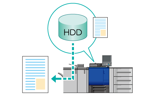 Cette section décrit la procédure d'impression d'une tâche stockée sur la machine ou d'une tâche enregistrée sur le disque dur via l'écran tactile de la machine ou via AccurioPro Print Manager.