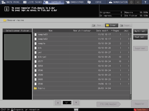 L'écran Dossier racine de l'écran RAPPELER s'affiche.