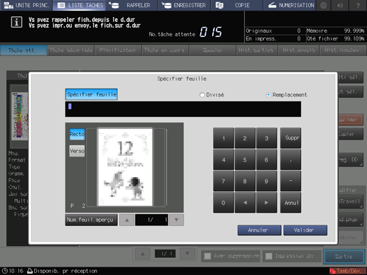 Sort la feuille spécifiée en mettant en attente les bons de travail existants. En spécifiant un Tampon/N° de page, vous réaffectez la feuille spécifiée.