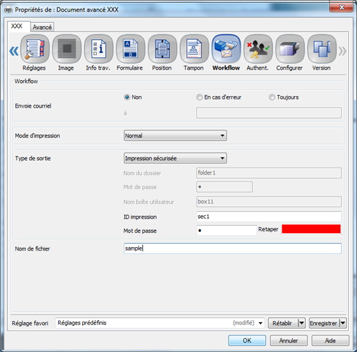 Cliquez sur l'onglet Workflow et sélectionnez Impression sécurisée dans le menu déroulant Type de sortie.