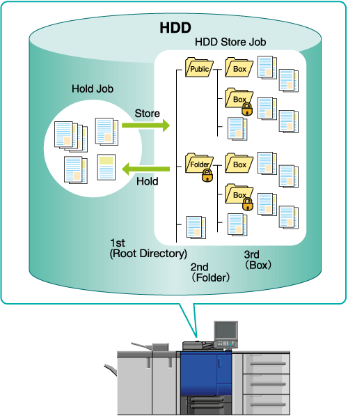 Utilisation de l'écran tactile de l'unité principale ou de AccurioPro Print Manager pour enregistrer une tâche en attente dans un dossier créé sur le disque dur. Rappel d'une tâche enregistrée sur le disque dur comme tâche en attente.