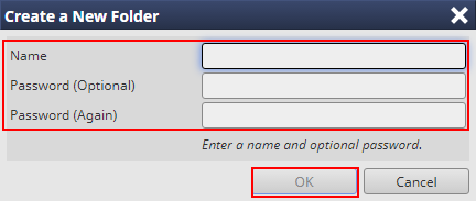 Explication supplémentaireEntrez le nom dans Nom sur l'écran Créer un nouveau dossier. Entrez le mot de passe sous Mot de passe si besoin. Cliquez sur OK pour afficher le dossier créé dans l'arborescence à gauche.
