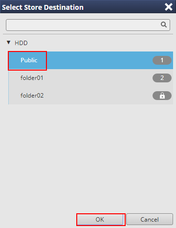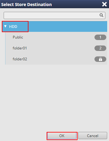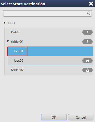 Explication supplémentairePour enregistrer une tâche dans une boîte (troisième niveau) sur le disque dur, sélectionnez une boîte dans l'arborescence de l'écran Sélectionner destination d'enregistrement, puis cliquez sur OK.