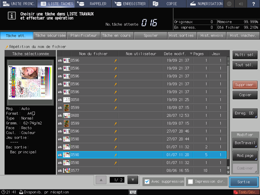 Explication supplémentaireL'écran Tâche en cours permet de gérer les tâches d'impression. Pour des détails, voirÉcran [Tâche en cours].