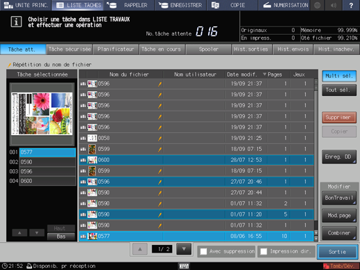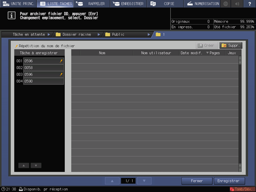 La machine enregistre la tâche sélectionnée à l'étape 3 dans le répertoire spécifié à l'étape 5 du disque dur.