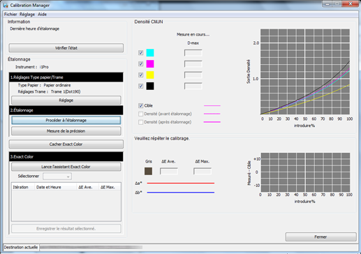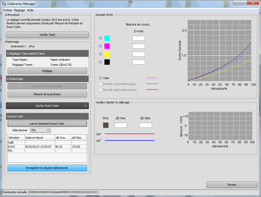 Vérifiez les résultats de mesure (densité CMJN et niveau de gris) sur l'écran Calibration Manager.