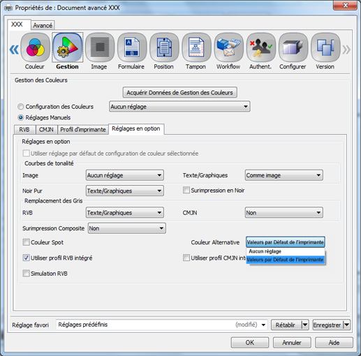 Gérer les couleurs|Application des couleurs alternatives pour l'impression avec le pilote d'imprimante (conversion des couleurs RVB en couleurs CMJN)