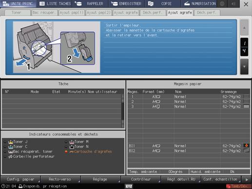Quand la cartouche d'agrafes de l'Unité de finition FS‑531 est vide, le message suivant apparaît dans la zone des messages de l'écran.