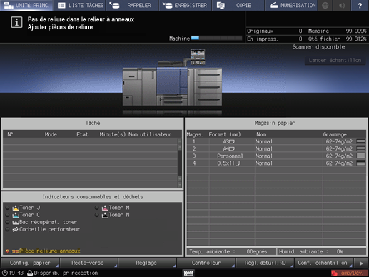 L'indicateur de pièces de reliure anneaux s'allume en rouge dans la zone Indicateurs consommables et déchets de l'écran UNITÉ PRINC.