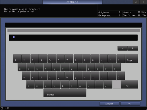 Cet écran s'affiche si vous sélectionnez Mot de passe plug-in formulaire sur l'écran Menu Configuration Contrôleur Machine . Pour en savoir plus sur l'affichage de l'écran Menu Configuration Contrôleur Machine, voir Présentation du contrôleur.