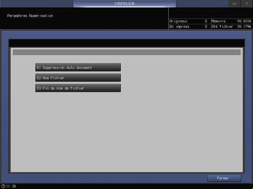 Cet écran s'affiche si vous sélectionnez Configuration scanner sur l'écran Menu Configuration Contrôleur Machine . Pour en savoir plus sur l'affichage de l'écran Menu Configuration Contrôleur Machine, voir Présentation du contrôleur.