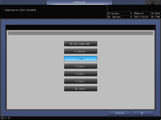 Valeur de réglage : | Ne pas supprimer, 12 heures, 1 jour, 2 jours, 3 jours, 7 jours, 30 jours |