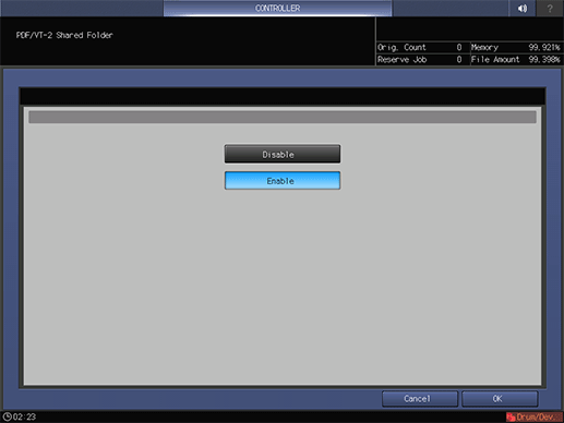 Cet écran s'affiche si vous sélectionnez Dossier partagé PDF/VT-2 dans l'écran Menu Configuration Contrôleur Machine. Pour en savoir plus sur l'affichage de l'écran Menu Configuration Contrôleur Machine, voir Présentation du contrôleur.