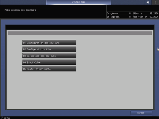 Cet écran s'affiche si vous sélectionnez Gestion des Couleurs sur l'écran Menu Configuration contrôleur machine. Pour en savoir plus sur l'affichage de l'écran Menu Configuration Contrôleur Machine, voir Présentation du contrôleur.
