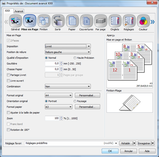 Cliquez sur l'onglet Finition, définissez Pliage et Détails de pliage en deux multi.