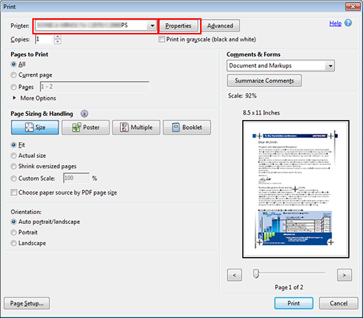 Sélectionnez l'imprimante à utiliser pour l'impression et cliquez sur Propriétés.