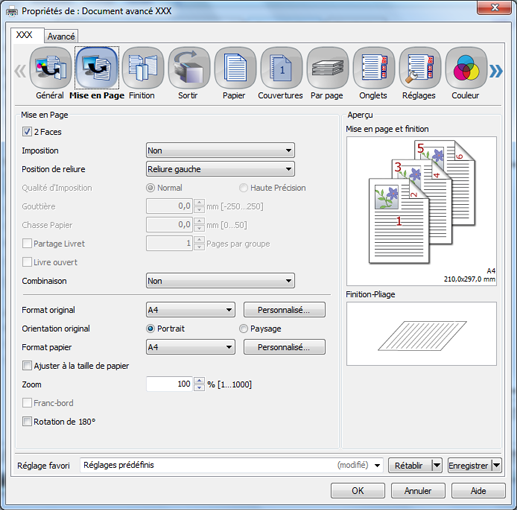 Lors de la configuration du pilote d'imprimante, assurez-vous d'avoir supprimé les réglages précédents des différents éléments des onglets Mise en Page, Finition, Couvertures, etc.