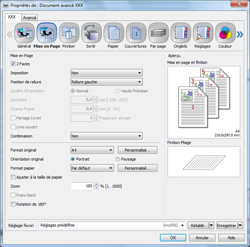 Lors de la configuration du pilote d'imprimante, assurez-vous d'avoir supprimé les réglages précédents des différents éléments des onglets Mise en Page, Finition, Couvertures, etc.