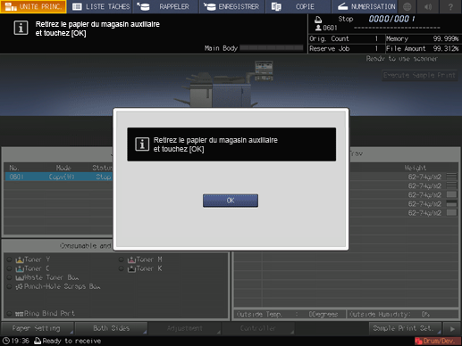 Si l'unité bannière MK-740 est montée sur le bac de sortie OT-510, le bac de sortie OT-511, l'unité de finition FS-531, l'unité de finition FS-532, l'unité de finition FS-612 ou l'unité relais RU-518, à chaque impression de 10 feuilles dans le bac auxiliaire, l'écran de confirmation Retirez le papier du magasin auxiliaire et touchez OK s'affiche et l'impression s'arrête, indépendamment du format papier. Retirez le papier du bac auxiliaire, appuyez sur Valider à l'écran. Appuyez sur la touche Départ du panneau de contrôle pour lancer l'impression.