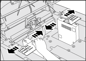 Si l'alimentation du papier échoue en raison du type, du format ou du grammage du papier, vous pouvez améliorer l'alimentation du papier en fixant les plaques de grammage fournies avec la machine au rouleau d'entraînement, comme illustré ci-dessous. Changez le nombre de plaques de grammage pour procéder à des réglages. Pour charger du papier de 256 g/m2 / 68 lb Bond ou plus dans l'unité grande capacité LU-202XLm, fixez deux plaques de grammage au préalable, puis changez le nombre de plaques de grammage pour procéder à des réglages.