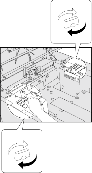 Explication supplémentaireTournez les quatre boutons de fixation des guides de la plaque-guide latérale (à gauche) dans le sens antihoraire pour les desserrer.