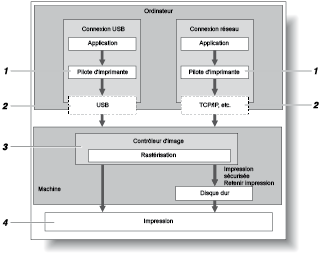 Les données sont envoyées au contrôleur d'image via l'interface USB en cas de connexion USB ou via Ethernet (TCP/IP, etc.) en cas de connexion réseau. Les données sont ensuite transmises à la machine par le contrôleur d'image.