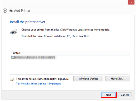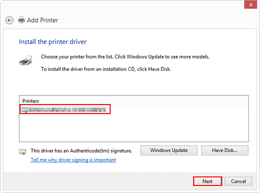 Explication supplémentaireSi la boîte de dialogue Installer le pilote d'imprimante apparaît, passez à l'étape 13.
