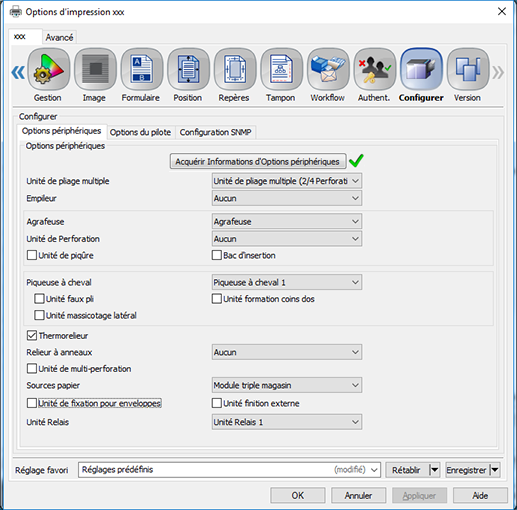 Après l'installation du pilote d'imprimante, vous devez définir un périphérique en option sur l'écran Option avant d'imprimer.