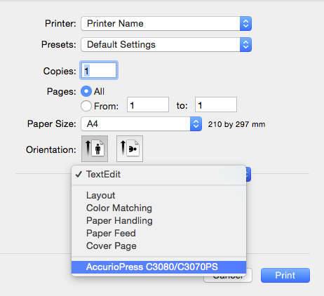 Sélectionnez AccurioPress C3080/C3070PS dans le menu déroulant de la boîte de dialogue et cliquez sur Set.