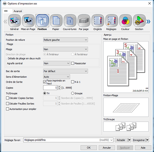 Ordre de sortie | Face imprimée vers le haut | Pour sortir le papier imprimé avec le recto vers le haut, sélectionnez Recto vers le haut. | |