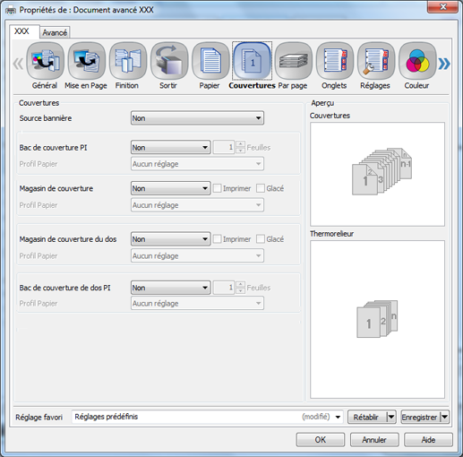 Profil Papier (Page de couverture) | Aucun réglage, Profil papier enregistré | Sélectionnez le profil papier prédéfini. Vous pouvez ajouter un nouveau profil papier à la liste sur l'écran tactile de la machine. |