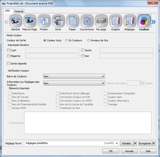 Barre de couleurs | Non, À gauche, En haut, À droite, En bas, Valeurs par défaut de l'imprimante | Définissez une position d'impression pour Barre de couleurs. |