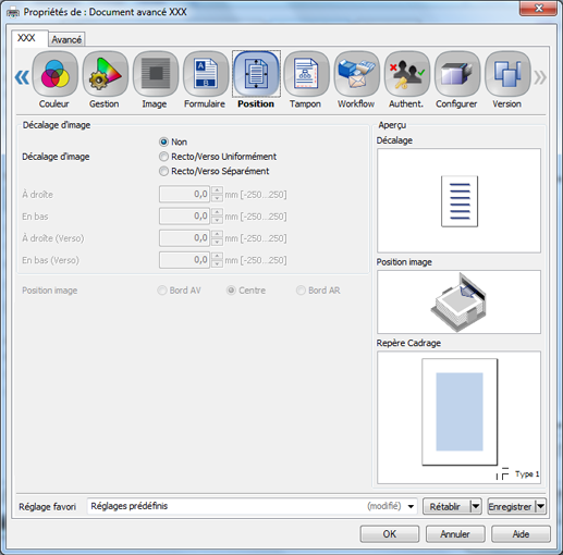Décalage d'image | Non, Recto/Verso Uniformément, Recto/Verso Séparément | Configurez ce réglage pour décaler la position d'impression de l'image horizontalement ou verticalement. À droîte : décalage horizontal de l'image sortie. (Valeur positive : décalage à droite, valeur négative : décalage à gauche) En bas : décalage perpendiculaire de l'image sortie. (Valeur positive : décalage vers le bas, valeur négative : décalage vers le haut) |