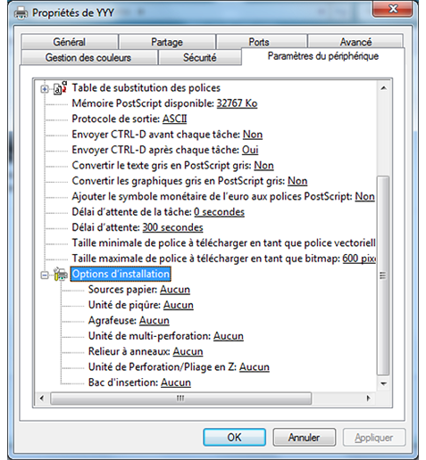 Vous pouvez définir un périphérique en option dans l'écran Paramètres unité et le rendre disponible pour le pilote d'imprimante.