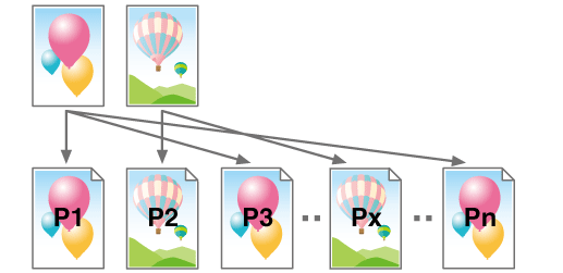 Quand un formulaire comprend deux pages, la page de formulaire 1 est assignée à la première page de la tâche, la page de formulaire 2 à la seconde page du travail et la page de formulaire 1 est réassignée à la troisième page comme sur l'illustration ci-dessous. Ce motif se répète.